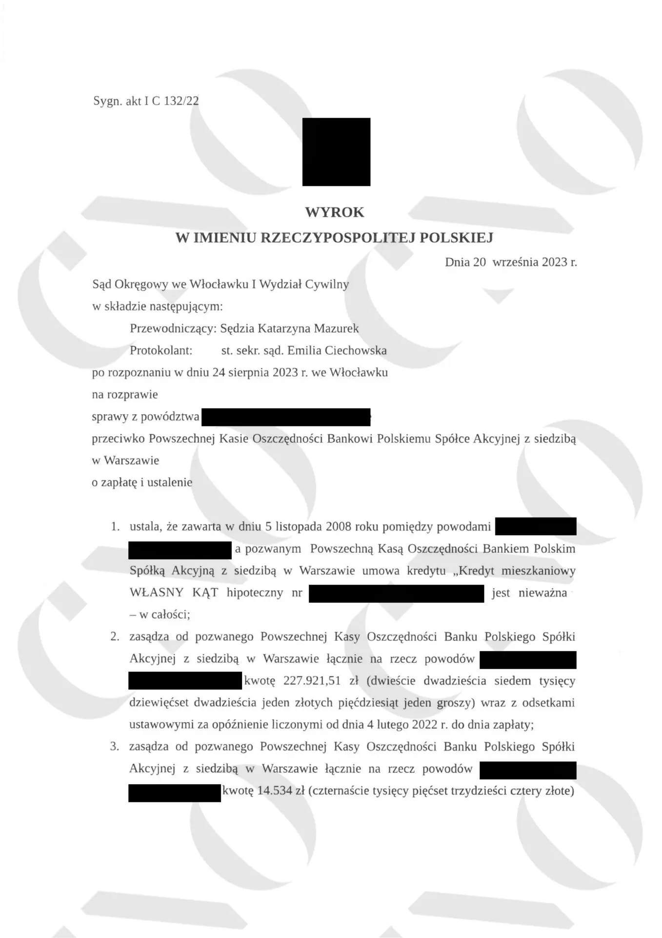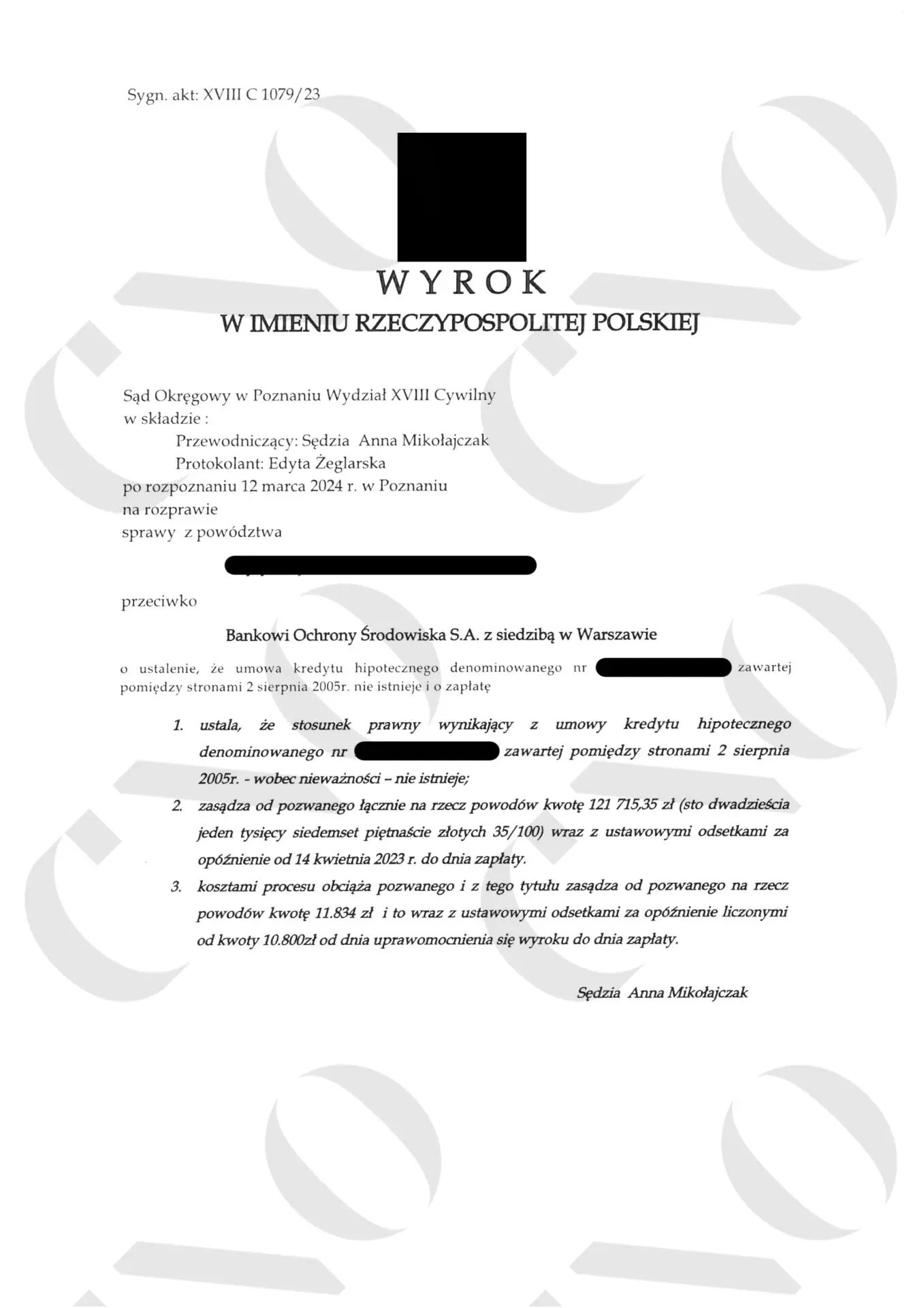 DOSKONAŁA Na podstawie 226 opinii Małgorzata Tłuchowska2025-05-14Trustindex sprawdza, czy pierwotnym źródłem recenzji jest Google. Kancelaria godna polecenia. Bardzo dobra współpraca w dwóch procesach "frankowych" zakończonych sukcesem. Profesjonalnie i cierpliwie. Amelia2025-05-12Trustindex sprawdza, czy pierwotnym źródłem recenzji jest Google. wykonałem dziś mnóstwo telefonów, mecenas Daniel Ostaszewski jako pierwszy i jedyny mnie nie zignorował i udzieli rzetelnej odpowiedzi, co więcej-bezpłatnie. chylę czoła Przemek Darul2025-04-30Trustindex sprawdza, czy pierwotnym źródłem recenzji jest Google. Nasza współpraca z kancelarią adwokacką Czyżewski & Ostaszewski rozpoczęła się półtora roku temu, gdy wraz z żoną zdecydowaliśmy się na podjęcie kroków prawnych w związku z kredytem frankowym. Od samego początku byliśmy pod ogromnym wrażeniem pełnego profesjonalizmu, jaki wykazali mecenasi z tej kancelarii. Już pierwszy kontakt z zespołem ekspertów z C&O dostarczył nam dowodów na ich zaangażowanie i wyjątkowe podejście do każdego klienta. Decydując się na współpracę z kancelarią, naszym priorytetem była transparentność, szczególnie w kwestiach finansowych, która jest kluczowym aspektem dla osób stawiających czoła skomplikowanym wyzwaniom prawnym. Kancelaria Czyżewski & Ostaszewski sprostała tym oczekiwaniom z wyjątkową skutecznością, zapewniając nam pełną przejrzystość i jasność w każdej fazie współpracy. Nasza sprawa, choć skomplikowana, została rozwiązana z niesamowitym powodzeniem. Przed wyrokiem pierwszej instancji otrzymaliśmy niezwykle korzystną propozycję ugody ze strony banku, co było możliwe dzięki konsekwentnym działaniom kancelarii. Zespół prawny C&O z ogromnym zaangażowaniem prowadził nas przez cały proces, zapewniając wsparcie i opiekę, które były nieocenione w doprowadzeniu ugody do finalizacji. Z pełnym przekonaniem mogę powiedzieć, że współpraca z kancelarią Czyżewski & Ostaszewski to inwestycja w wiedzę, profesjonalizm oraz indywidualne podejście, które uwalnia od stresu związanego z kredytem frankowym. Dziękuję całemu zespołowi za ich nieocenione wsparcie i ogromne zaangażowanie, które pozwoliło nam zamknąć ten rozdział naszego życia. Z pełną satysfakcją rekomenduję kancelarię Czyżewski & Ostaszewski każdemu, kto poszukuje rzetelnych i skutecznych rozwiązań prawnych. Joanna Jo2025-02-07Trustindex sprawdza, czy pierwotnym źródłem recenzji jest Google. Cztery lata temu zgłosiłam się do Kancelarii z prośbą o poprowadzenie mojego procesu sadowego przeciwko bankowi. Chodziło o kredyt we Frankach. Dziś jestem nie tylko uwolniona od dalszej spłaty kredytu ale bank wypłacił należne odsetki za zwłokę . Było to możliwe dzięki ogromnemu profesjonalizmowi Kancelarii Czyżewski & Ostaszewski. Od samego początku współpraca układała się znakomicie, byłam na bieżąco informowana o postępach w sprawie. Przez cztery lata zespół Kancelarii , w tym mec. Jacek Firlej no i oczywiście mec. Daniel Ostaszewski- szef działu, wykazywali najwyższy poziom kompetencji, co oczywiście skutkowało moim całkowitym zaufaniem do działań Kancelarii. Z ogromną przyjemnością i przekonaniem polecam usługi Kancelarii Czyżewski & Ostaszewski. I ze swej strony pragnę podziękować za reprezentowanie mnie w procesie i doprowadzenie go do SUKCESU!!! Dziękuję. Z Uszanowaniem.. Joanna K. Mirosław Cybuch2024-12-13Trustindex sprawdza, czy pierwotnym źródłem recenzji jest Google. Polecam Kancelarię C&O. Profesjonalne prowadzenie postępowania. Jasne i przejrzyste zasady wynagrodzenia. Bieżące informacje o każdym etapie postępowania. Duże doświadczenie i przyjazne podejście do klienta sprawiają, że współpraca z kancelarią C&O jest przyjemnością i gwarancją sukcesu. Magdalena2024-12-08Trustindex sprawdza, czy pierwotnym źródłem recenzji jest Google. Kancelaria godna zaufania oraz polecenia. Współpracujemy w zakresie kredytu frankowego- od początku nakreślono nam bardzo czytelne zasady współpracy. Kancelaria wspiera nas na każdym etapie tej trudnej drogi, bardzo sprawnie rozwiewa wszelkie nasze wątpliwości, wyjaśnia zawiłości. Jesteśmy świeżo po rozprawie w I instancji- pełen sukces- za co jesteśmy ogromnie wdzięczni <3 Brawo Wy :) marek rybicki2024-10-21Trustindex sprawdza, czy pierwotnym źródłem recenzji jest Google. Kancelarię prawną C&O cenię przede wszystkim za podejście do klienta, dzięki któremu wizyta w kancelarii i sama rozprawa przebiegła dla mnie bezstresowo. Pracują tam ludzie z ogromną wiedzą pozwalającą ocenić szansę wygranej. Bardzo dobry kontakt i szybka odpowiedź na maile. Umowa z kancelarią sformułowana jest bardzo jasno, a ceny usług są bardzo atrakcyjne w stosunku do innych znanych kancelarii. Klara Klara2024-09-30Trustindex sprawdza, czy pierwotnym źródłem recenzji jest Google. Kancelaria prawna C&O zakończyła naszą "przygodę z bankiem". Umowę frankową sąd unieważnił. Prawnicy z kancelari C&O przeprowadzili nas profesjonalnie i bez żadnych problemów, wszystko nam dobrze wyjaśniano i przygotowano do rozprawy. Bank wypłacił nam nadpłaconą kwotę. Dziękujemy Panu Ostaszewskiemu, który nas reprezentował. Tom Asz2024-09-17Trustindex sprawdza, czy pierwotnym źródłem recenzji jest Google. Pełen profesjonalizm. Wzór dla innych kancelarii. Polecam. Dani3LL1L2024-09-03Trustindex sprawdza, czy pierwotnym źródłem recenzji jest Google. Profesjonalizm i zaangażowanie na najwyższym poziomie. Sprawa kredytu frankowego załatwiona po naszej myśli w 4 miesiące.