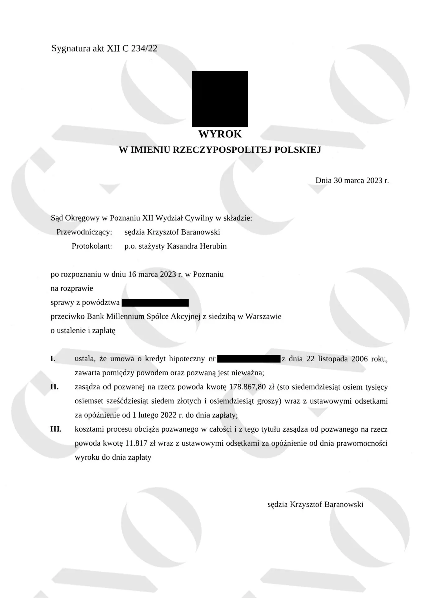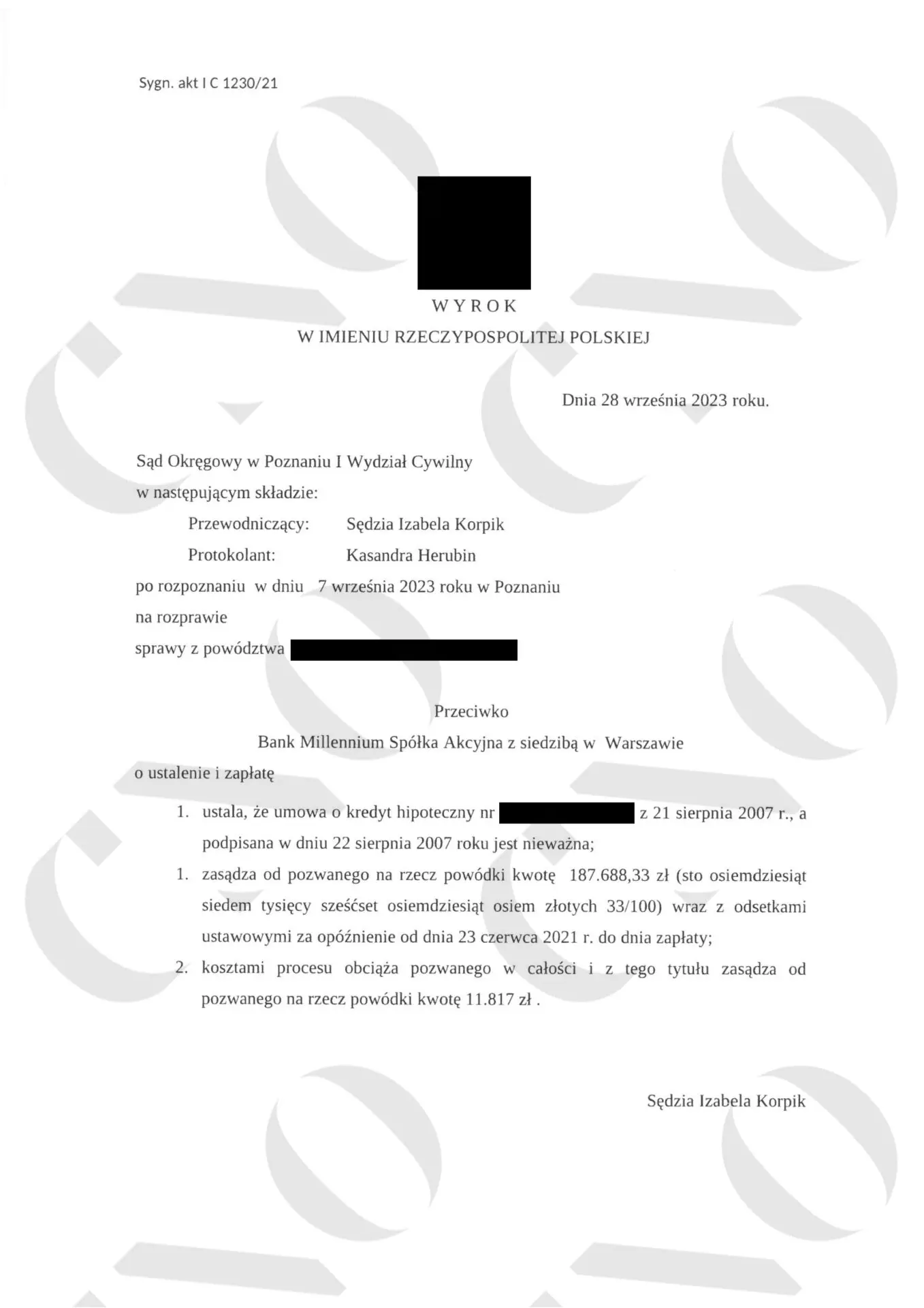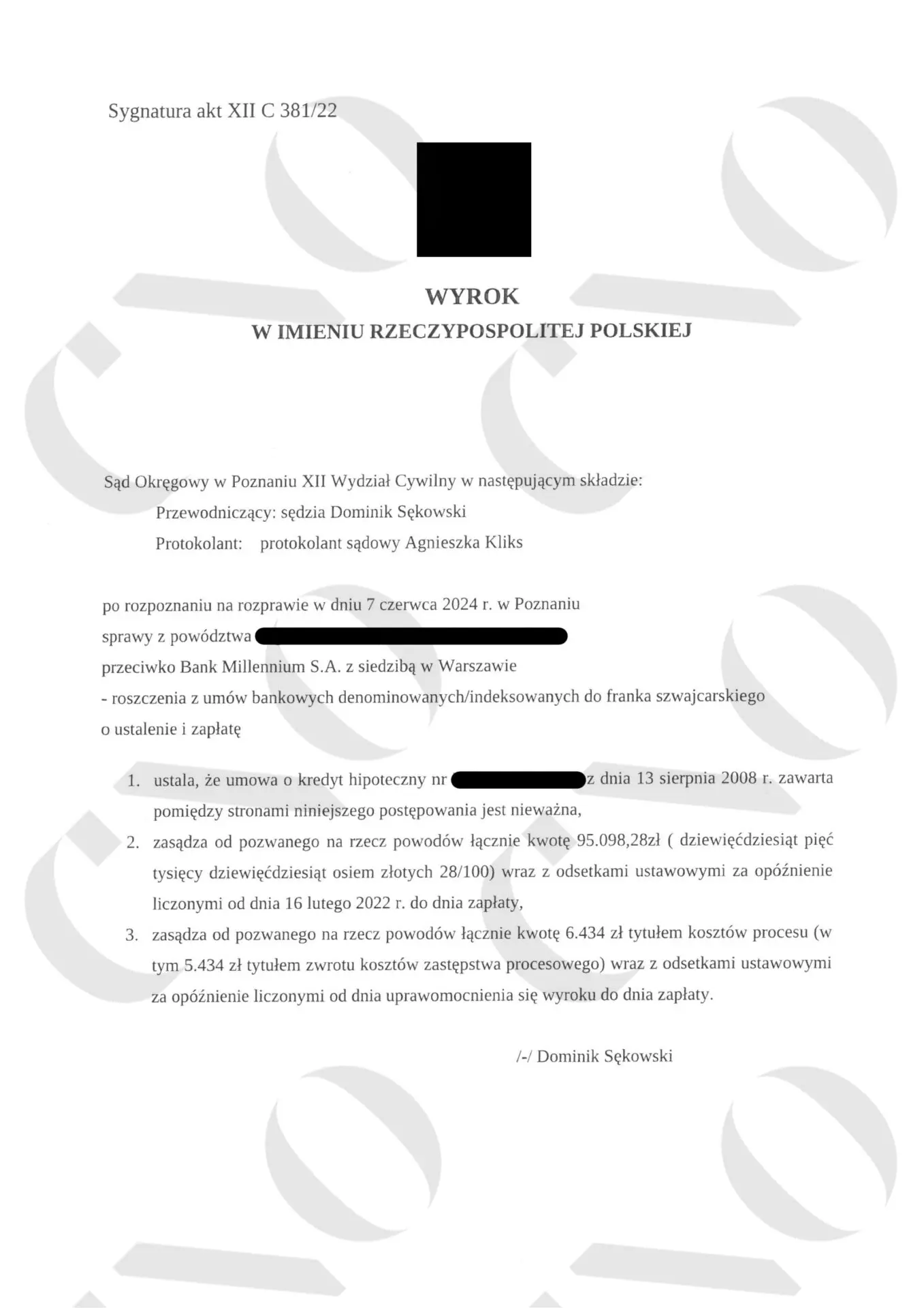 Po złożeniu pozwu prowadzimy Twoją sprawę kompleksowo – reprezentujemy Cię przed sądem, przygotowujemy wszystkie pisma i na bieżąco informujemy o postępach. Dbamy o Twoje przygotowanie do przesłuchania, a po wygranej sprawie pomagamy rozliczyć się z bankiem i wykreślić hipotekę.